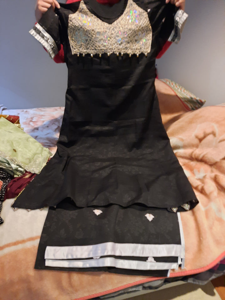 فستان من القطن والحرير باللون الأسود مطرز على قماش قطني مطبوع ذاتيًا